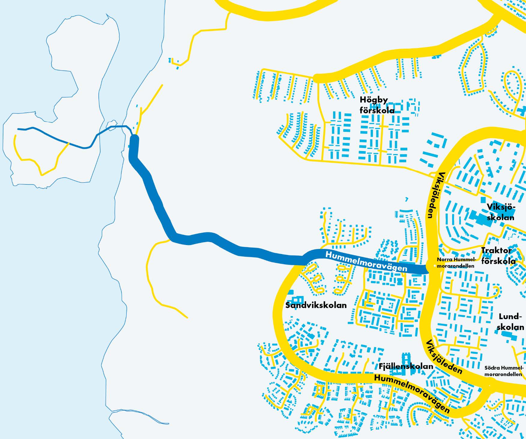 Det är främst sträckan mellan norra Hummelmorarondellen och Vattenverksvägen som kommer beröras av de ökade transporterna. Genom att förlägga transporterna till den angivna sträckan kan vi undvika att passera de skolor som finns i området.